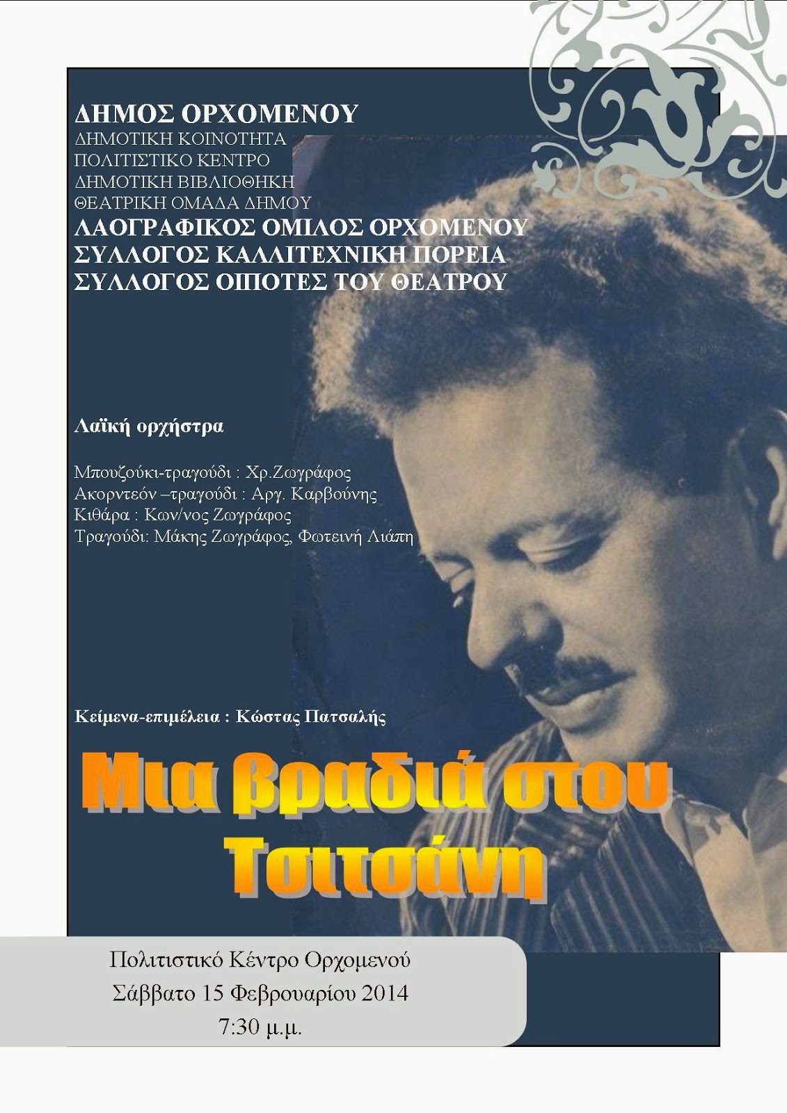 Στην εκδήλωση – αφιέρωμα θα συμμετέχουν τα μουσικά σχήματα:• «Η παρέα του Τσιτσάνη», που απαρτίζεται από: Δώρα Στρουθοπούλου (τραγούδι), Νίκος Ζυγούρας (κιθάρα – τραγούδι), Νίκος Στρουθόπουλος (μπουζούκι – τραγούδι), Ντίνος Χριστιανόπουλος (τραγούδι)
