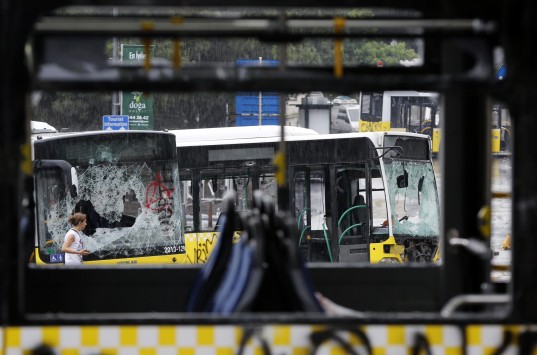 Οι διαδηλωτές απάντησαν ρίχνοντας πέτρες ενώ κατέστρεψαν διαφημιστικές πινακίδες, φανάρια και έσπασαν τζάμια των γύρω καταστημάτων.